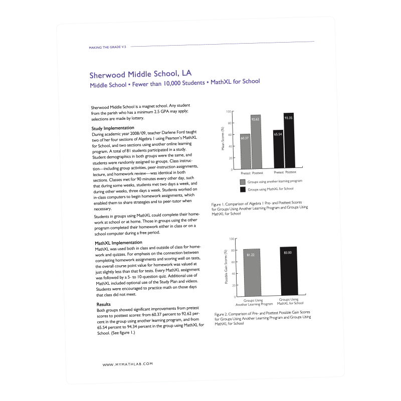 After using MathXL for School® in a classroom setting as a test, increased scores led Sherwood Middle School to adopt it for use with all Algebra students. Accessibility from home and by parents, useful data insights, and defensible grading were noted as success metrics of the program.