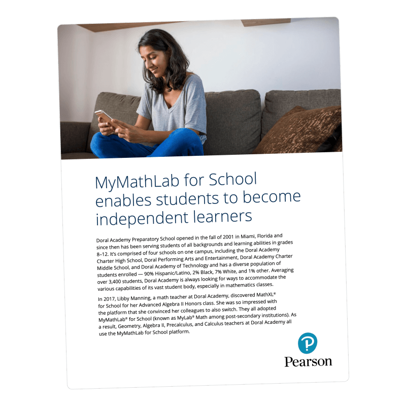 With 3,400 students, Doral Academy needed a solution to address a broad range of capabilities for its students. MyMathLab was the answer, offering educators the ability to customize learning to student and classroom needs, and helping with efficiency, vital to a school with a large student population.